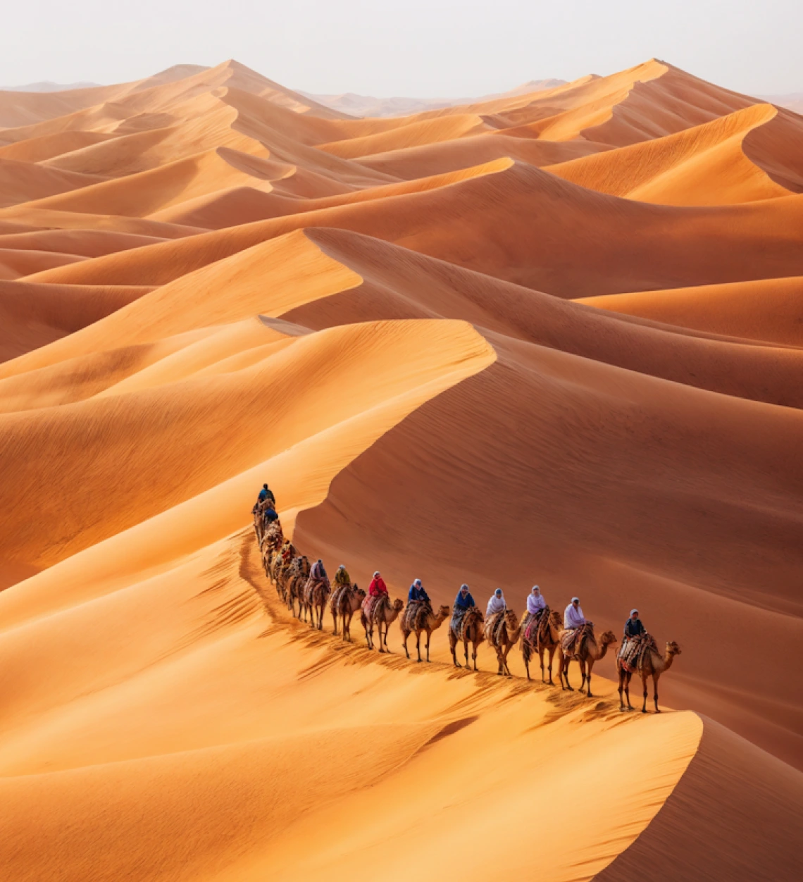 Journey across golden desert dunes on a majestic camel trek, discovering timeless beauty, tranquil sunsets, and authentic Arabian adventure.